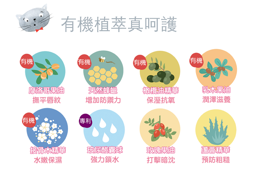 ◎有機橄欖油精華:保濕抗氧、滲透性極佳,如薄紗般保護雙唇